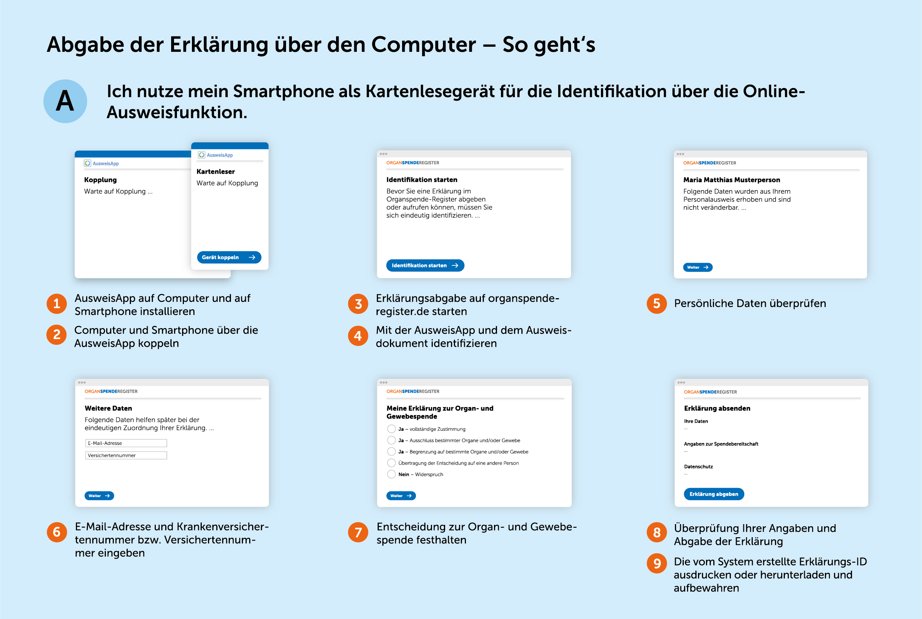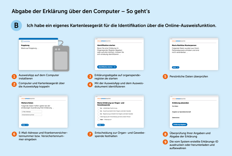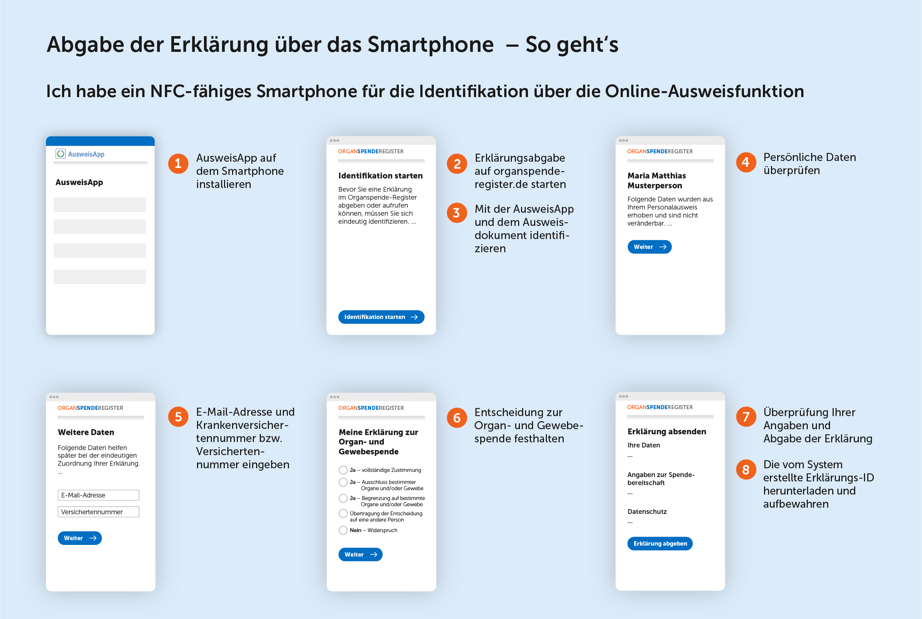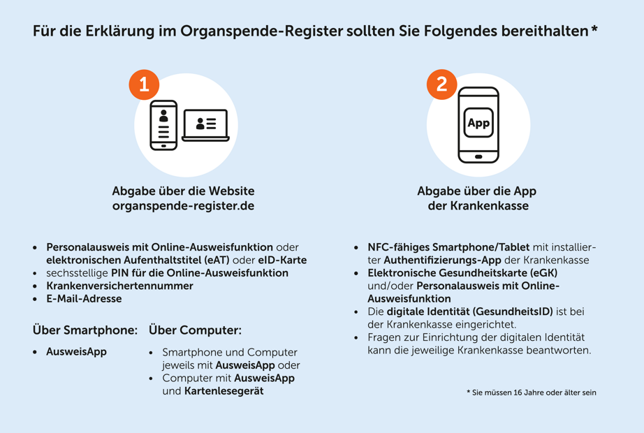 Haben Sie sich entschieden und wollen Sie Ihre Erklärung abgeben? Sehr gut! Bitte nutzen Sie möglichst Ihren Standard-Browser, um Ihre Erklärung im Organspende-Register einzutragen oder abzurufen. Der Inkognito- oder private Surfmodus kann zu Fehlermeldungen führen. Bevor Sie Ihre Entscheidung im Organspende-Register hinterlegen können, prüfen Sie am besten, ob Ihnen alles Notwendige dazu vorliegt.