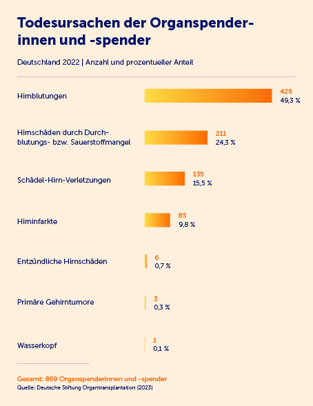 Der Hirntod ist immer Folge einer schweren Hirnschädigung. Auslöser können Erkrankungen wie Hirnblutungen, Hirntumoren, Schlaganfällen oder Hirnhautentzündungen sein. Ebenso können äußere Einwirkungen wie zum Beispiel ein Unfall das Gehirn schädigen. Das Gehirn kann auch indirekt geschädigt werden, indem die Atmung zum Stillstand kommt und in der Folge das Gehirn nicht mehr durchblutet wird. Ursachen dafür können unter anderem schwere Herzrhythmusstörungen oder ein Herzinfarkt sein.